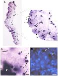 Cystoblast showing the mitochondrial aggregate (long arrow) and several lobes of the nucleus (short arrows), hematoxylin and eosin staining (A). Spectrin is