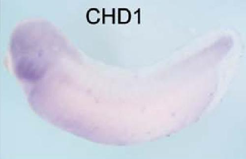 chd1 (chromodomain helicase DNA binding protein 1) gene expression in Xenopus laevis embryo, assayed via in situ hybridization, NF stage 28, lateral view, anterior left, dorsal up.