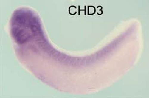 chd3 (chromodomain helicase DNA binding protein 3) gene expression in Xenopus laevis embryo, assayed via in situ hybridization, NF stage 28, lateral view, anterior left, dorsal up.