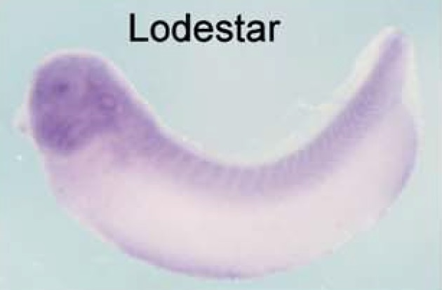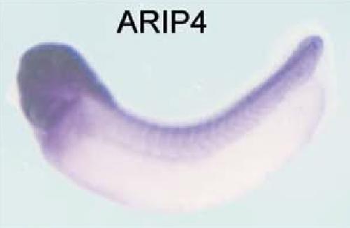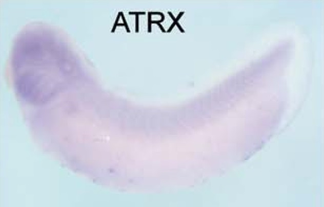 atrx (alpha thalassemia/mental retardation syndrome X-linked) gene expression in Xenopus laevis embryo, assayed via in situ hybridization, NF stage 28, lateral view, anterior left, dorsal up.
