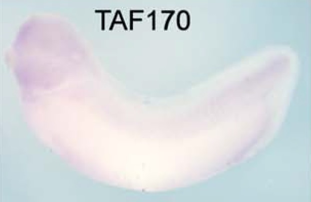 btaf1 (B-TFIID TATA-box binding protein associated factor 1) gene expression in Xenopus laevis embryo, assayed via in situ hybridization, NF stage 28, lateral view, anterior left, dorsal up.