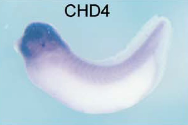chd4 (chromodomain helicase DNA binding protein 4) gene expression in Xenopus laevis embryo, assayed via in situ hybridization, NF stage 28, lateral view, anterior left, dorsal up.