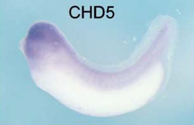 chd8 (chromodomain helicase DNA binding protein 8) gene expression in Xenopus laevis embryo, assayed via in situ hybridization, NF stage 28, lateral view, anterior left, dorsal up.