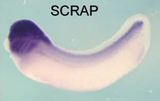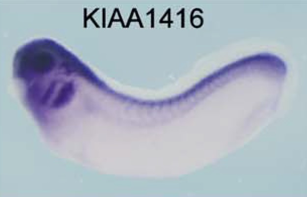 srcap (Snf2-related CREBBP activator protein) gene expression in Xenopus laevis embryo, assayed via in situ hybridization, NF stage 28, lateral view, anterior left, dorsal up.