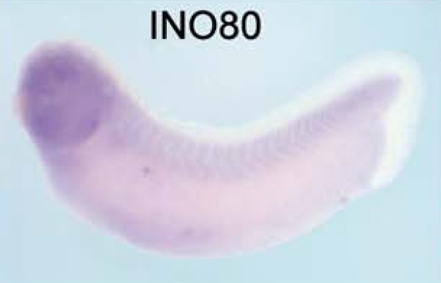 ino80 (INO80 complex ATPase subunit) gene expression in Xenopus laevis embryo, assayed via in situ hybridization, NF stage 28, lateral view, anterior left, dorsal up.