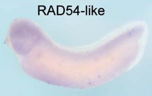 rad54l (RAD54-like) gene expression in Xenopus laevis embryo, assayed via in situ hybridization, NF stage 28, lateral view, anterior left, dorsal up.