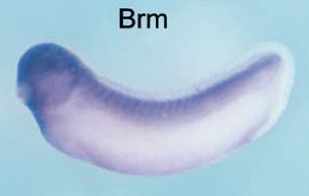 expression domains are in detail discussed in the text. Anterior is to the left and dorsal side up. (B) Expression pattern of xBrm. Slightly oblique transversal