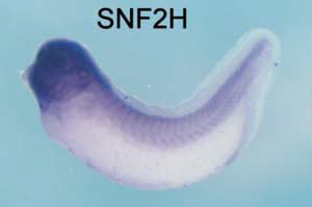 smarca5 (SWI/SNF related, matrix associated, actin dependent regulator of chromatin, subfamily a, member 5) gene expression in Xenopus laevis embryo, assayed via in situ hybridization, NF stage 35, lateral view, anterior left, dorsal up.