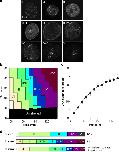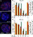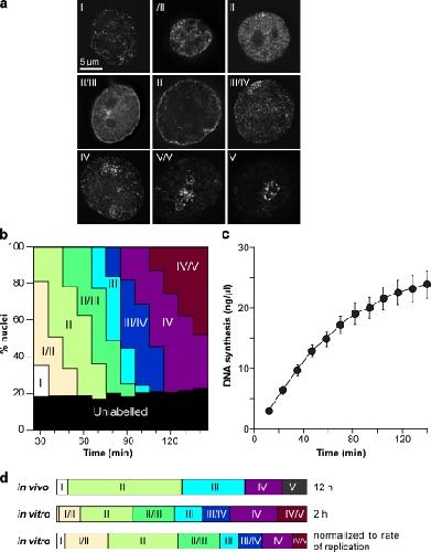 Figure 2. Initiation times associated with different replication patterns. CHOC-400 nuclei were incubated at 10,000 nuclei/µl in egg extracts supplemented with geminin. At different times, aliquots were supplemented with 1 mM roscovitine to block further initiation events. (a) Extract was also supplemented with α-[32P]dATP at the start of the incubation. At different times thereafter, total DNA synthesis was measured by TCA precipitation and scintillation counting. (b) At different times, extract was pulse labeled with Cy3-dUTP for 5 min, and the proportion of nuclei showing different replication patterns was assessed. (c) Data from a and b were combined to provide an estimate of the times over which most initiation events associated with the different replication patterns were occurring.
