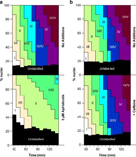 Figure 3. Effect of aphidicolin and caffeine on the timing program. (a and b) CHOC-400 nuclei were incubated at 10,000 nuclei/µl in egg extracts supplemented with geminin ± 3 µM aphidicolin (a) or 5 mM caffeine (b). At different times, extract was pulse labeled with Cy3-dUTP for 5 min, and the proportion of nuclei showing different replication patterns was assessed.