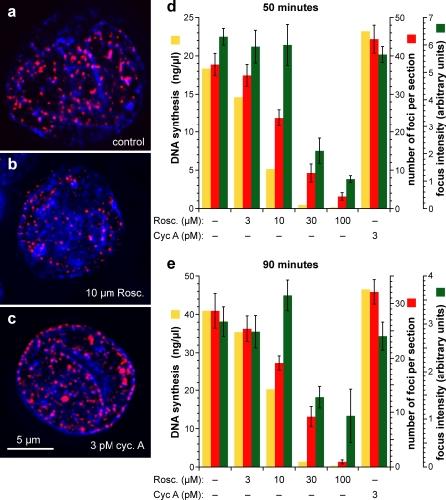 Figure 7. Replication foci number depends on Cdk levels. CHOC-400 nuclei were incubated in X. laevis egg extracts incubated at 10,000 nuclei/µl in egg extracts supplemented with the indicated concentrations of roscovitine (rosc) or cyclin A (cyc A). Parallel incubations were supplemented with α-[32P]dATP to measure total DNA synthesis. At 50 or 90 min, extract was pulsed for 5 min with Cy3-dUTP. (a–c) Representative images from the 50-min time point are shown. (d and e) The number and mean intensity of Cy3-labeled foci at 50 (d) and 90 (e) min were measured. Error bars indicate SEM between different nuclei.