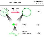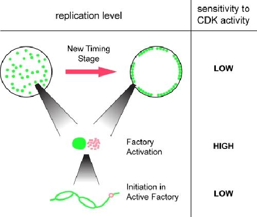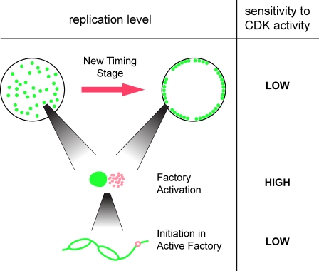 Figure 9. Cdk sensitivity of different levels of replication control. Cartoon showing three different levels of S phase control. The top level shows progression between two different stages of the timing program for a single nucleus. Small green dots represent replication factories, and the black circles represent the nuclear envelope. The middle level shows the activation of a new replication factory (pink dots) next to an existing factory (large green dot). The lower level shows the initiation of a new replication origin (pink circle) on a strand of DNA (green) within an active factory (active replicon cluster).