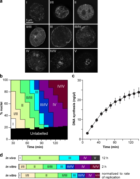Figure 1. Progression of CHOC-400 nuclei through the timing program in vitro. CHOC-400 nuclei were incubated at 10,000 nuclei/µl (∼60 ng DNA/µl) in egg extracts supplemented with geminin. (a) Representative images of CHO nuclei incubated in X. laevis egg extracts and pulse labeled for 5 min with Cy3-dUTP. See Materials and methods for full description of the different labeling patterns. (b) At different times, aliquots were pulse labeled for 5 min with Cy3-dUTP, and the proportion of different replication patterns was assessed. (c) Extract was supplemented with α-[32P]dATP. At different times, total DNA synthesis was measured by TCA precipitation and scintillation counting. The SEM of 14 independent experiments is shown. (d, top) The time of appearance of replication patterns during S phase of CHOC-400 cells as described previously by Dimitrova and Gilbert (1999). (middle) The proportion of time spent by CHOC-400 nuclei replicating specific patterns as calculated in b. (bottom) The amount of DNA synthesis associated with each replication pattern in vitro calculated by scaling the proportions in b by the rate of replication (c).