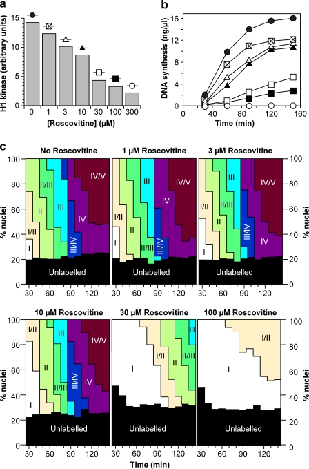 Figure 4. Effect of low concentrations of roscovitine on the timing program. (a) Extract was supplemented with histone H1, γ-[32P]ATP, and various concentrations of roscovitine. After incubation for 90 min, protein was separated by SDS-PAGE, and 32P incorporation into H1 was assessed by phosphorimager. (b and c) CHOC-400 nuclei were incubated at 10,000 nuclei/µl in egg extracts supplemented with geminin and different concentrations of roscovitine. Aliquots were also supplemented with α-[32P]dATP at the start of the incubation. (b) At different times thereafter, total DNA synthesis was measured by TCA precipitation and scintillation counting. (c) At different times, extract was pulse labeled with Cy3-dUTP for 5 min, and the proportion of nuclei showing different replication patterns was assessed. No replication patterns were visible in extracts treated with 300 µM roscovitine.