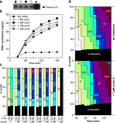 Figure 5. Effect of recombinant cyclin A on the timing program. (a) Extract was supplemented with histone H1 γ-[32P]ATP and various concentrations of cyclin A. After incubation for 90 min, protein was separated by SDS-PAGE and 32P incorporation into H1 assessed by phosphorimager. (b and c) CHOC-400 nuclei were incubated at 10,000 nuclei/µl in egg extracts supplemented with geminin and different concentrations of recombinant cyclin A. (b) Aliquots were also supplemented with α-[32P]dATP at the start of the incubation. At different times afterward, total DNA synthesis was measured by TCA precipitation and scintillation counting. (c) At either 45 or 85 min, extract was pulse labeled with Cy3-dUTP for 5 min, and the proportion of nuclei showing different replication patterns was assessed. (d) Extract was supplemented ± 1 pM cyclin A. At different times, extract was pulse labeled with Cy3-dUTP for 5 min, and the proportion of nuclei showing different replication patterns was assessed.