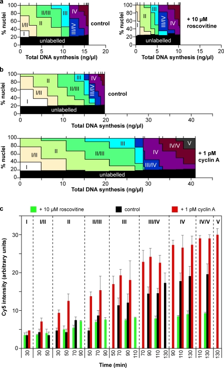 Figure 6. Decoupling of replication and the timing program. CHOC-400 nuclei were incubated at 10,000 nuclei/µl in egg extracts supplemented with geminin ± 10 µM roscovitine or 1 pM recombinant cyclin A. (a and b) Data from Fig. 5 and Fig. S2 are shown where the replication patterns at different times are plotted against the total DNA synthesis that had occurred at each time. Vertical ticks above the plot indicate the boundaries of different time points. (c) Extract was also supplemented with Cy5-dCTP at the start of the incubation. At different times, aliquots were pulse labeled with Cy3-dUTP for 5 min, and individual nuclei were analyzed for replication pattern (Cy3 label) or total DNA synthesis (Cy5 label). Error bars indicate mean ± SD.