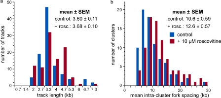 Figure 8. DNA fiber analysis. (a and b) CHOC-400 nuclei were incubated at 10,000 nuclei/µl in egg extracts supplemented with geminin minus (blue) or plus (red) 10 µM roscovitine (rosc). After incubation for 45 min, extract was pulsed with BrdUTP for 5 min. DNA was isolated, spread on glass slides, and the BrdU-labeled tracks were analyzed. The length of isolated tracks (a) and the distribution of forks within clusters are shown (b).