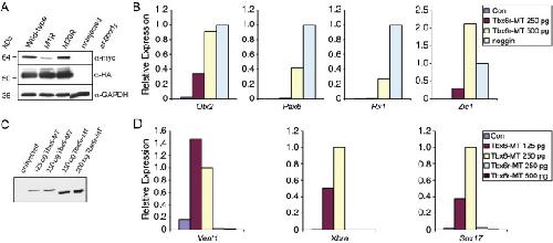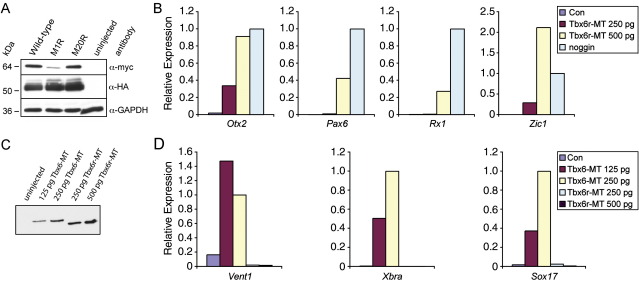 Supplementary Fig. 2. The biological activity of Tbx6r is atypical of the Tbx6 sub-family. (A) Determination of translational start codon by western analysis. Lanes contain lysates from early gastrula stage 10 embryos injected at the 1-cell stage with 500 pg RNA made from the wild-type myc-tagged Tbx6r-MT construct or from derivatives in which either of the first two methionines were mutated (M1R and M20R). All injected samples were spiked with 500 pg Xbra-HA as translation control and the blot was probed sequentially with anti-myc, anti-HA and anti-GAPDH antibodies, the last of these acting as a loading control. (B) Expression of anterior neural markers in animal caps cultured to stage 23 with the RNA amount injected into the 1-cell embryo specified in picograms. Expression in all samples was normalised to that of ornithine decarboxylase (ODC) as was the case for all subsequent experiments. The animal cap assay was performed three times and results of a representative experiment are shown. Here, the level of induction depicted is relative to that caused by 400 pg noggin RNA. (C) Comparison of translation efficiency of the Tbx6r-MT and Tbx6-MT constructs in NF10 embryos; siblings to those shown in D. (D) Expression of mesodermal and endodermal markers in NF 11.5 animal caps. Induction is depicted relative to that caused by 250 pg Tbx6. Control caps in (B) and (D) were derived from uninjected embryos.