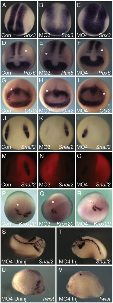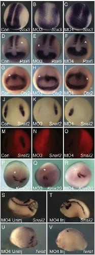 Fig. 8. Neural patterning in Tbx6r-depleted embryos. All embryos were unilaterally injected at the 2-cell stage with 25Â ng indicated morpholino except AâC, which were injected with 50Â ng at the 1-cell stage. The morpholinos were lissamine-labelled to allow determination of injected side marked by an asterisk (MâO are fluorescent images of the embryos in JâL). In situ probes used are indicated on the figures. (AâC) dorsal views of neurula, anterior at bottom; (DâR) anterior views of neurula; (SâV) lateral views of tailbud embryos; T, V are injected sides of embryos in S, U respectively.