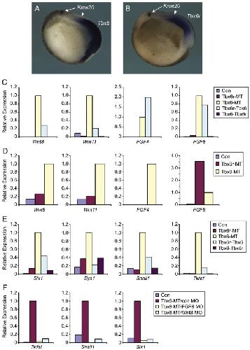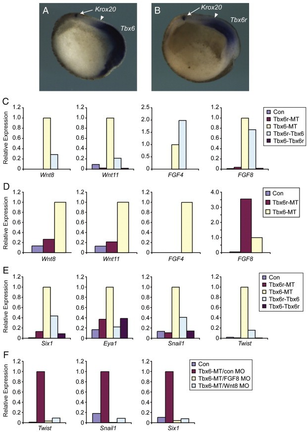 Fig. 10. Tbx6 and Tbx6r induce FGF8 and neural plate border markers. (A) Tbx6 expression and (B) Tbx6r expression in the mesoderm of parasagittally bisected stage 15 embryos co-stained with the neurectodermal marker Krox20. (C) Differential ligand-inducing activities of Tbx6, Tbx6r and the hybrid constructs in gastrula-stage caps. 500Â pg of each RNA was injected. (D) FGF8 is induced by 500Â pg Tbx6râMT in stage 23 caps. (E) Neural plate border induction in stage 23 animal caps. (F) Inhibition of Tbx6-mediated neural plate border induction by 500Â pg Tbx6âMT RNA in stage 23 animal caps by 50Â ng morpholino targeting either FGF8 or Wnt8. Experiments were independently duplicated (C, D, F) or triplicated (E); representative results of individual experiments are shown. Control caps in (C) to (F) were derived from uninjected embryos.