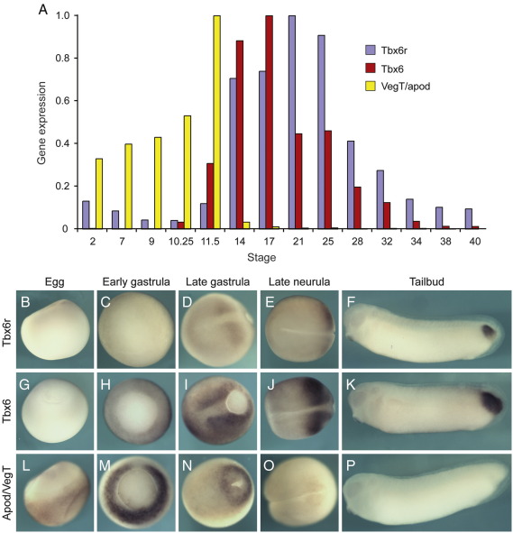 Supplementary Fig. 1. Comparative spatiotemporal expression analysis of Tbx6r, Tbx6 and VegT/apod. (A) Temporal analysis of the expression of the three genes during X. laevis development measured by quantitative RT-PCR. (B-P) Spatial analysis of gene expression by in situ hybridisation. B, G, L: side view; C, H, M: vegetal view; D, E, I, J, N, O: dorsal view, anterior to left; F, K, P: lateral view, anterior to left.