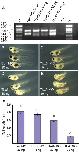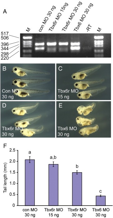 Fig. 6. Phenotypic defects resulting from depletion of Tbx6r and Tbx6 in X. tropicalis. (A) Efficacy of splicing morpholino in siblings of embryos pictured in BâE. The upper band is of a size consistent with an unspliced product and may represent pre-mRNA since it is present in all samples. XtTbx6r MO inhibits splicing significantly but incompletely. Tbx6r splicing is not affected in Tbx6 morphants. Embryos were injected at the one-cell stage with the following morpholinos: 30 ng GeneTools control (B), 15 ng XtTbx6r (C), 30 ng XtTbx6r (D), 30 ng XtTbx6 (E). Tail lengths were measured from the proctodeal opening to the tail tip at stage 41. Mean values ± the standard error of the mean are shown in (F). Measurements were subjected to ANOVA followed by Scheffe's Test of Least Significant Difference. The annotations a, b and c above the bars on the graphs represent statistically significant differences between groups at p < 0.05.
