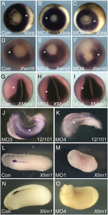 Fig. 7. Mesoderm patterning in Tbx6r-depleted embryos. Embryos were injected unilaterally at the 2-cell stage with 25Â ng of the indicated morpholino. The probes used are indicated on the images. All images are of in situ hybridisations except J and K, which are antibody stains. Asterisks indicate injected sides. (AâF) vegetal views of gastrulae; (GâI) dorsal views of neurula; (JâK) dorsal views of tailbud embryos, anterior to left. (LâO) are lateral views of hemi-injected tailbud embryos.