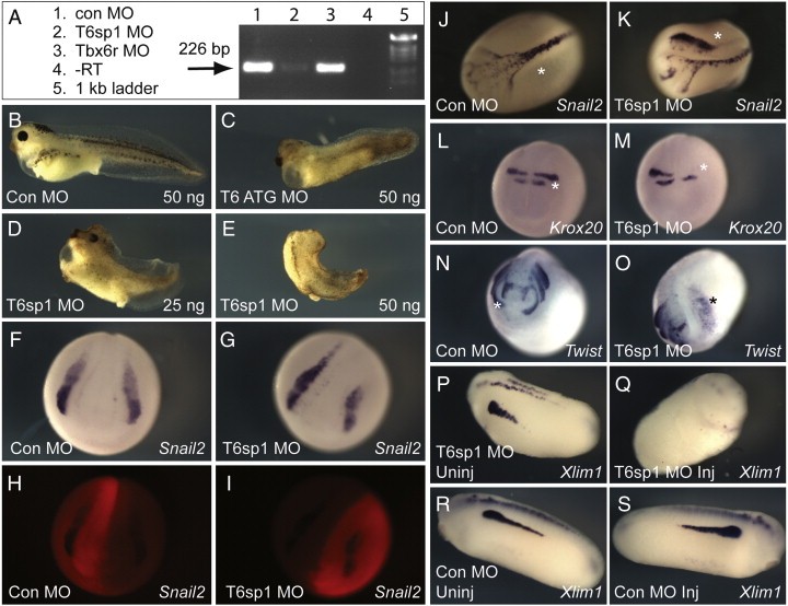 Fig. 9. Embryos lacking Tbx6 have defects in neural crest and paraxial mesoderm formation. (A) Test of Tbx6 splicing morpholino (T6sp1) efficacy and specificity by RT-PCR. The 226Â bp amplicon indicating correct splicing of Tbx6 is greatly reduced in stage 16 embryos injected with 50Â ng T6sp1 MO but unaffected in siblings injected with 50Â ng Tbx6r MO4. (BâE) Morphant phenotypes of Tbx6 translation-blocker (T6 ATG MO) and splice-blocker (T6sp1 MO) morpholinos. (FâR) In situ analysis of embryos unilaterally injected (*) with 25Â ng T6sp1 MO at the 2-cell stage. F, J, L, N were injected with control morpholino; G, K, M, O were injected with T6sp1 MO. H and I are fluorescent images of the anterior views of the neurula depicted in F and G respectively, showing distribution of the lissamine-labelled morpholino. P and Q show uninjected and T6sp1 MO-injected sides of the same tailbudembryo; R and S are the equivalent images of a control-injected morphant. J, K: dorsal views; LâO anterior views.