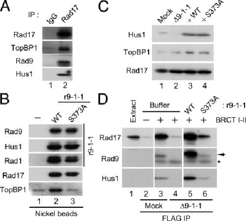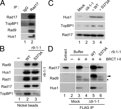 Figure 1. Binding of TopBP1 to the Rad17/9-1-1 complex is dependent on Ser373 of Rad9. (A) Control IgG (lane 1) and anti-Rad17 antibodies (lane 2) were used for immunoprecipitation of egg extracts. Associated proteins were examined by immunoblotting with indicated antibodies. (B) Recombinant 9-1-1 complexes containing WT His6-Rad9 (r9-1-1-WT, lane 2) or the S373A mutant form of His6-Rad9 (r9-1-1-S373A, lane 3) were incubated in interphase egg extracts. Control buffer was added in lane 1. Nickel agarose beads were incubated in the extracts, retrieved, and immunoblotted for the indicated proteins. (C) Mock-depleted (lane 1) and 9-1-1–depleted extracts supplemented with buffer alone (lane 2), r9-1-1-WT (lane 3), or r9-1-1-S373A (lane 4) were immunoblotted for Hus1 (to monitor the 9-1-1 complex), TopBP1, and Rad17. (D) Mock-depleted extracts (lanes 2 and 3) and 9-1-1–depleted extracts supplemented with buffer alone (lane 4), r9-1-1-WT (lane 5), or r9-1-1-S373A (lane 6) were prepared and incubated for 1 h with anti-FLAG antibody beads in the absence (lane 2) or presence of the FLAG-tagged BRCT I–II fragment of TopBP1 (lanes 3–6). The beads were retrieved, and associated proteins were examined by immunoblotting with indicated antibodies. Anti-Rad9 antibodies detected Rad9 (arrow) as well as the cross-reacting BRCT I–II band (asterisk). Lane 1 depicts 1.5 μl of initial egg extract.