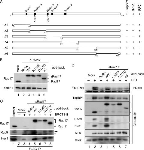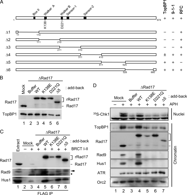 Figure 3. Rad17 regulates the chromatin accumulation of 9-1-1 and TopBP1 in an ATP-dependent manner. (A) Various constructs of Rad17 with internal deletions were generated and their binding to BRCT I–II (TopBP1), Hus1 (9-1-1), and RFC40 (RFC) was examined (see Supplemental Figure 1A). Binding of Rad17 to the indicated proteins is indicated as strong (+), weak (±), or negligible (−). (B) Mock-depleted (lane 1) and Rad17-depleted extracts supplemented with buffer alone (lane 2), rRad17-WT (lane 3), rRad17-K138E (lane 4), rRad17-D221Q (lane 5), or rRad17-Δ5 (lane 6) were immunoblotted for Rad17 and TopBP1. (C) The indicated extracts from B were incubated with anti-FLAG antibody beads in the absence (lane 2) or presence of the FLAG-tagged BRCT I–II fragment of TopBP1 (lanes 3–8). The beads were retrieved and immunoblotted for the indicated proteins. Lane 1 depicts 1.5 μl of initial egg extract. Rad9 (arrow) and the cross-reacting BRCT I–II band (asterisk) are marked. (D) The indicated extracts from B were incubated with sperm chromatin in the absence (lane 1) or presence of aphidicolin (lanes 2–7). Aliquots of the extracts were incubated with 35S-Chk1. Nuclear fractions from these incubations were processed for phosphorimaging (top panel). Other aliquots were processed for isolation of chromatin fractions and immunoblotting with indicated antibodies (bottom panels).
