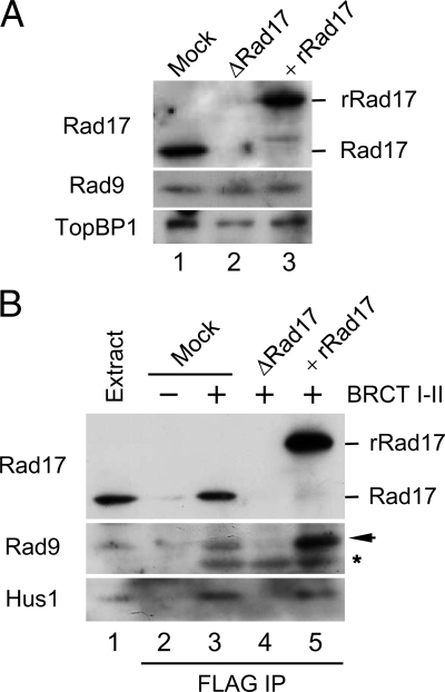 Figure 2. Rad17 regulates the interaction of 9-1-1 with TopBP1. (A) Mock-depleted (lane 1) and Rad17-depleted extracts supplemented with buffer (lane 2) or recombinant Rad17 (rRad17; lane 3) were immunoblotted for the indicated proteins. (B) The indicated extracts from A were incubated in the absence (lane 2) or presence of the FLAG-tagged BRCT I–II fragment of TopBP1 (lanes 3–5) for 1 h with anti-FLAG antibody beads. The beads were retrieved, and associated proteins were examined by immunoblotting with indicated antibodies. Rad9 (arrow) and the cross-reacting BRCT I–II band (asterisk) are marked. Lane 1 depicts 1.5 μl of initial egg extract.