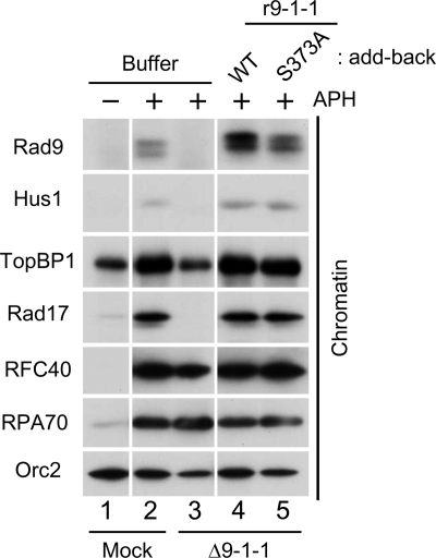 Figure 4. Rad17/9-1-1 complex but not phospho-Ser373 of Rad9 is required for the checkpoint-related accumulation of TopBP1 at stalled replication forks. Mock-depleted extracts (lane 1 and 2) and 9-1-1–depleted extracts supplemented with buffer alone (lane 3), r9-1-1-WT (lane 4), or r9-1-1-S373A (lane 5) were incubated with sperm chromatin in the absence (lane 1) or presence of aphidicolin (lanes 2–5). Chromatin fractions were isolated and immunoblotted with the indicated antibodies.