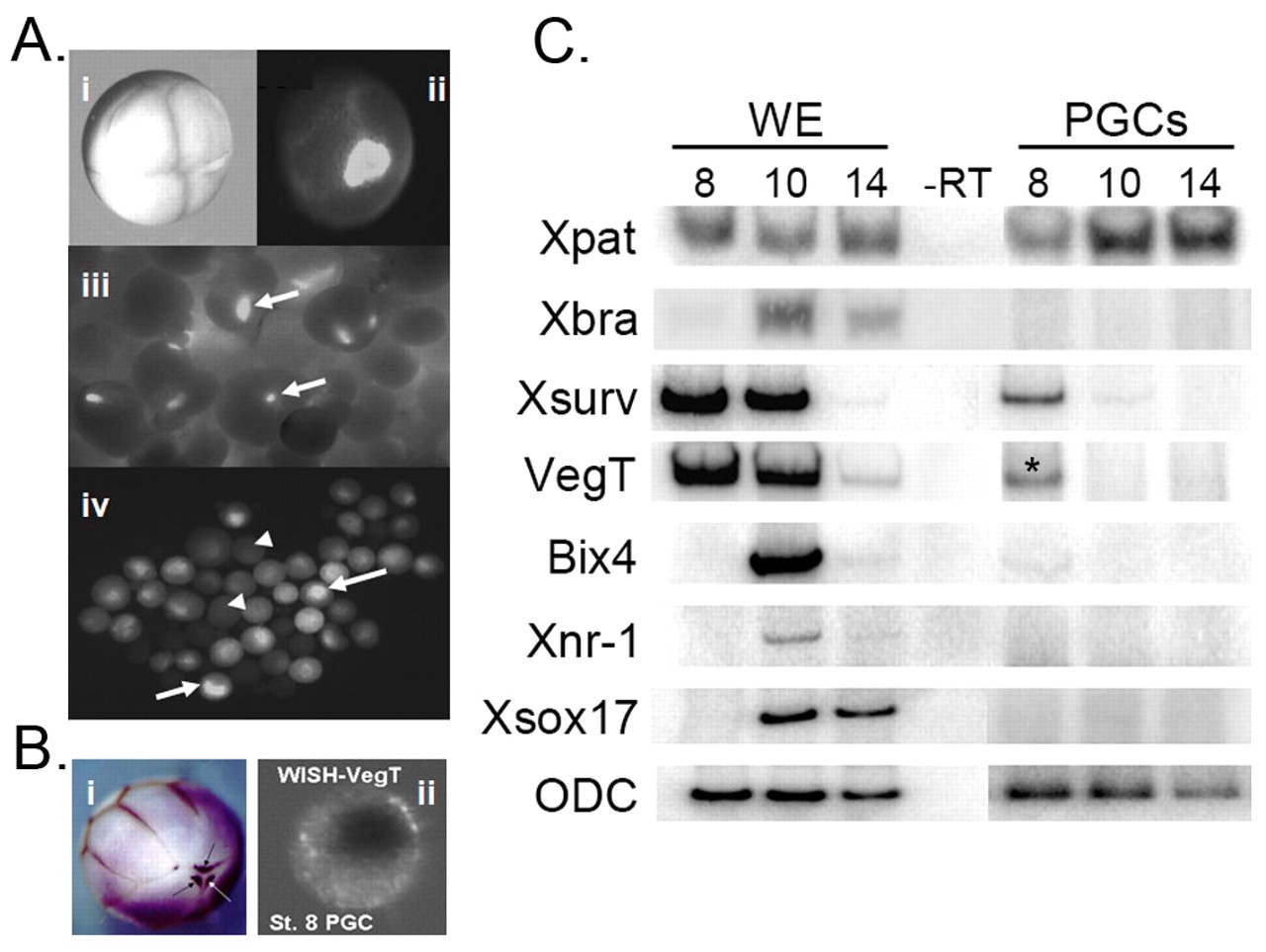 Fig. 1. PGC isolation and gene expression analyses in Xenopus embryos. (A) PGCs can be identified based on the distinctive fluorescence staining of the germ plasm with DiOC6. (i) Eight-cell embryo and (ii) corresponding image after stereofluorescence microscopy showing DiOC6 staining of vegetal pole germ plasm. (iii) PGCs near the floor of the blastocoel just after removal of the animal cap (arrows). (iv) Stereofluorescence microscopy of PGCs (arrows) and unstained somatic cells (arrowheads) from embryos dissociated at gastrula (stage 10). (B) VegT RNA is found in PGCs. WISH with anti-VegT probe of (i) early embryo and (ii) isolated PGC from a blastula-stage embryo. (C) Zygotic genes are not expressed in PGCs at MBT. Gene expression in PGCs isolated before (stage 8) and after (stages 10 and 14) MBT was compared with that in whole embryos (WE) by semi-quantitative RT-PCR with gene-specific primers. Xpat, PGC-specific marker; Xbra, mesoderm marker; Bix4, Xnr1 and Xsox17, endodermal-specific and downstream targets of maternal VegT; Xsurv (survivin), a maternal gene. Presence of Xpat but not Xbra or zygotic VegT at stage 10 and 14 indicates that PGCs were not contaminated with mesoderm. Zygotic VegT, a spliced variant of maternal VegT, is expressed at post-MBT stages in the mesoderm. Ornithine decarboxylase (ODC) served as a control. PGCs did not express endoderm markers (Bix4, Xnr1, Xsox17), but did contain maternal VegT RNA (asterisk).
