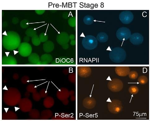 pre-MBT stage 8 embryos previously stained with DiOC6 (A) to identify