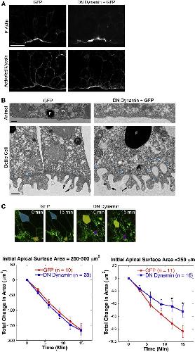 (C) Quantification of blastopore depth and bottle cell morphometrics in DN dynamin-injected embryos. *p < 0.01, **p < 0.001, zp < 0.05 for GFP versus