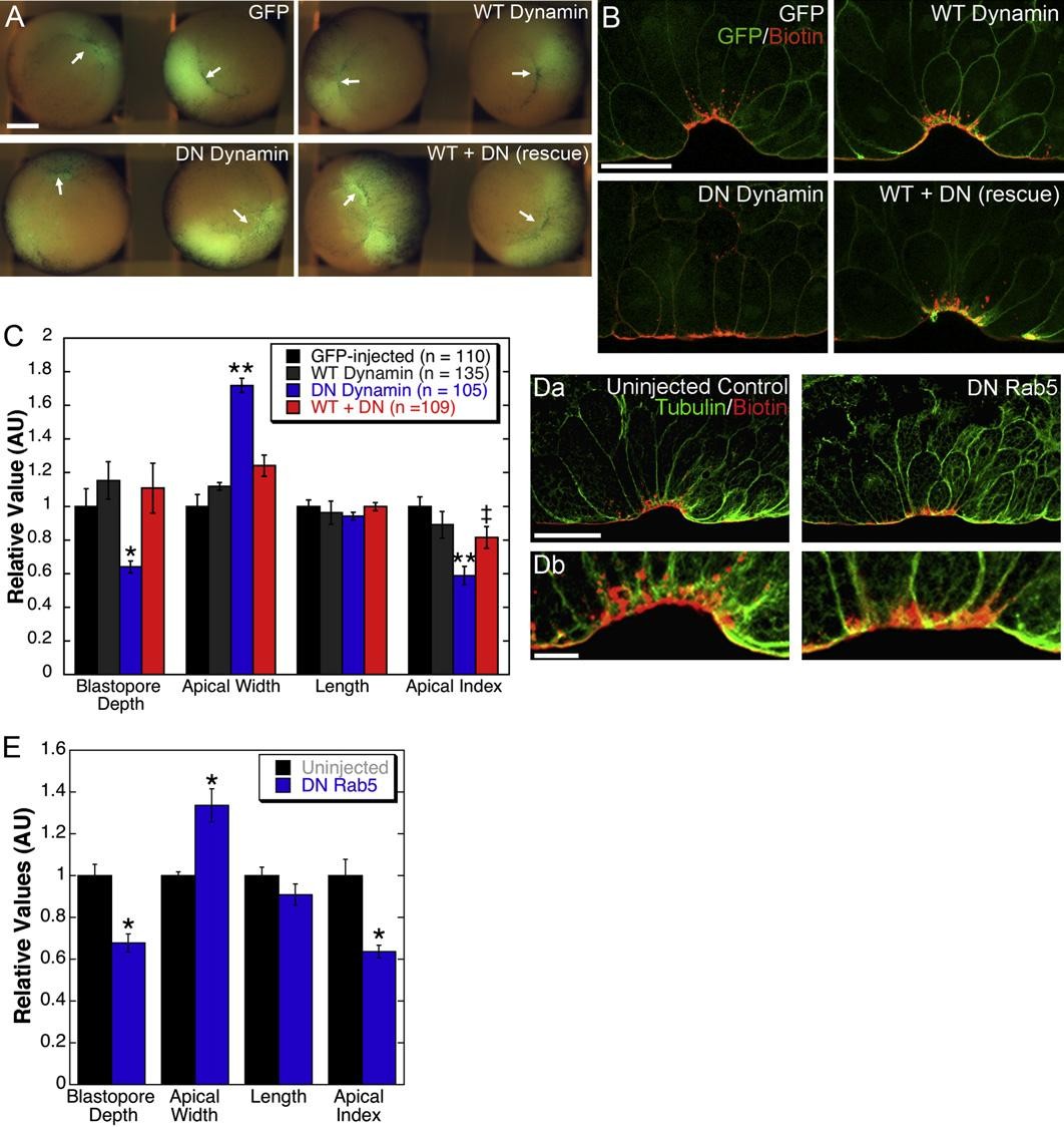 Figure 2. Dominant-Negative Dynamin and Dominant-Negative Rab5 Disrupt Bottle Cell Formation by Affecting Apical Constriction