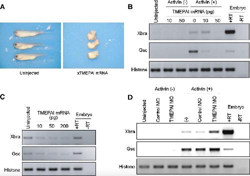 Figure 5. TMEPAI Blocks Activin Signaling in Xenopus Embryos (A) Ectopic expression of xTMEPAI in dorsal cells. mRNA coding for xTMEPAI (50 pg) was injected into two dorsal blastomeres at the four-cell stage. Phenotypes of embryos were determined at the tadpole stage (the typical examples are shown). (B) Inhibitory effect of xTMEPAI on expression of mesoderm markers in animal caps stimulated with activin. xTMEPAI mRNA was injected alone or together with activin mRNA (2 pg) near the animal pole of two-cell embryos, and animal caps were explanted at the blastula stage. Total RNAs were prepared and analyzed by RT-PCR. Histone was used as an internal control. +RT and âRT indicate reverse transcriptional reaction using normal embryos with and without reverse transcriptase, respectively. (C) RT-PCR analysis of the DMZ expressing xTMEPAI. xTMEPAI mRNA was injected into the DMZ at the four-cell stage. Subsequently, RNAs were prepared from embryos at stage 11. +RT and âRT indicate reverse transcriptional reaction using normal embryos with or without reverse transcriptase. (D) Knockdown of xTMEPAI enhances expression of mesoderm markers in animal caps stimulated with activin. TMEPAI MO and control MO were injected alone or together with activin mRNA (3 pg) near the animal pole of two-cell embryos, and animal caps were explanted at the blastula stage. All other experiments were performed according to Figure 5B. |