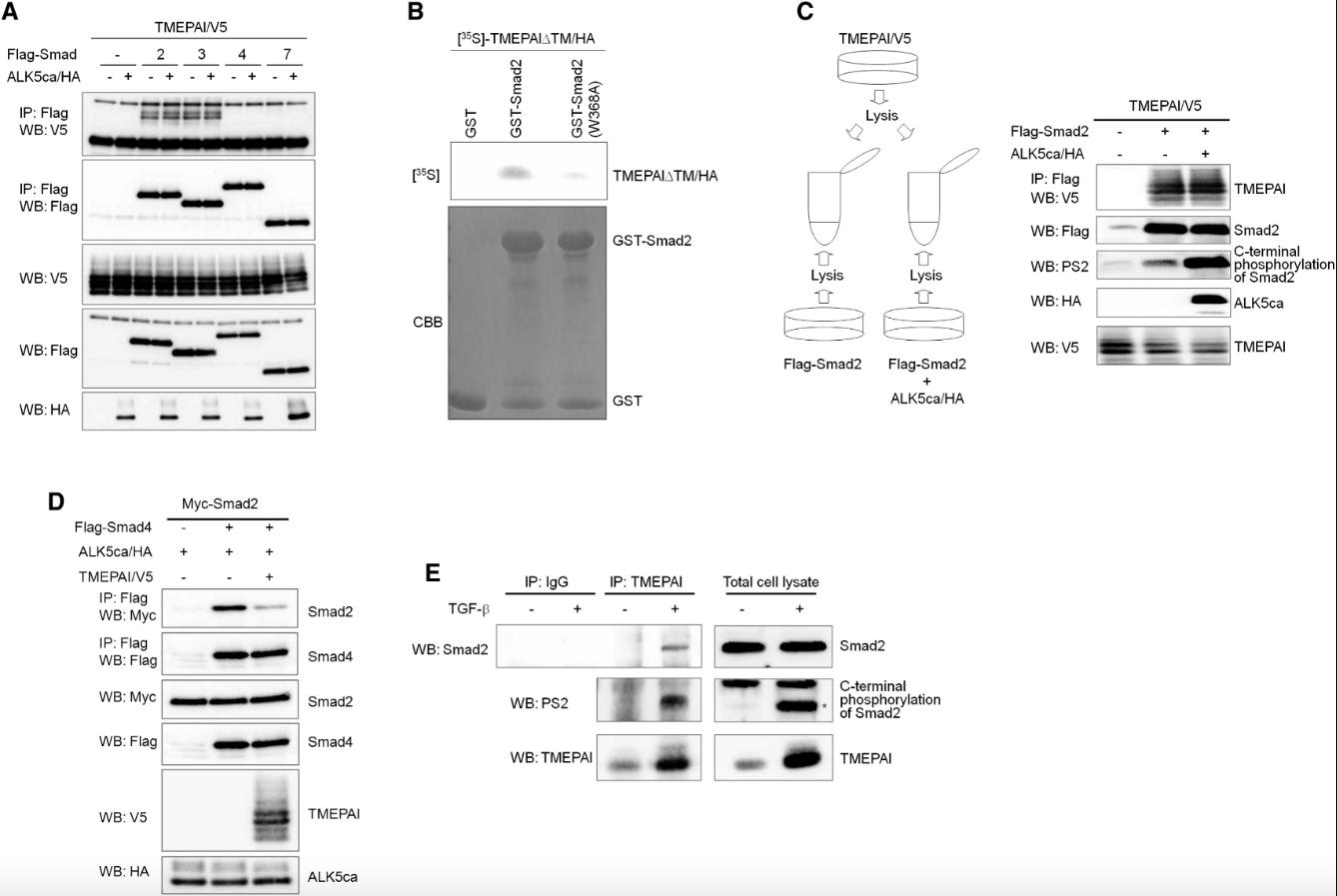 Figure S9. Interaction of TMEPAI with Smad2 COS7 cells were transfected with indicated plasmids and harvested for Co-IP experiments. Since Smad2 mutants lacking the MH1 domain interacted with TMEPAI more strongly than wild-type Smad2, two panels for short and long exposures are shown as results of co-IP. |