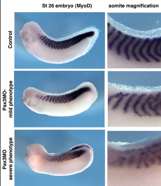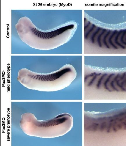 Supp. Fig. 4 . Pax3 morphants display strongly affected myotome segmentation. Although Pax3 morphants display more prominent MyoD expression than Pax7 morphants, myotome segmentation is perturbed, ranging from mild to severe defects.