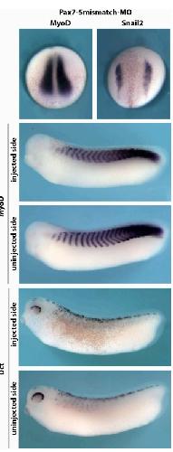 Supp Fig. 5. Pax7 mismatch MO phenotype. A 5-mismatched MO corresponding to the translation start site (same target site as Pax7MO, see Supplemental Fig. 2) was injected. Embryo development, early gene expression (myod and snail2) as well as later gene expression (myod, dct) were normal compared to sibling or between the injected and control sides for unilateral injections.