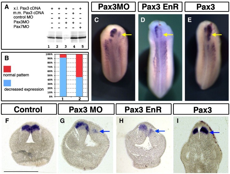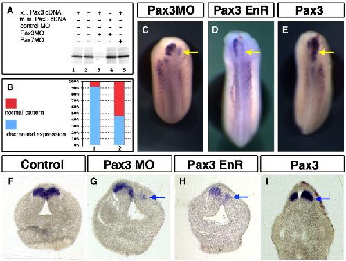 Fig. 4. Pax3 regulates pax7 expression and alar plate patterning in the brain. (A) Pax3 depletion using an antisense morpholino (Pax3MO) specifically prevents Xenopus laevis pax3 translation in vitro (lane 3). Pax7MO and a control MO have no effect on Xenopus laevis pax3 translation while Mus musculus pax3 is unaffected by Pax3MO. (B) Following Pax3 depletion in vivo (bar 1), pax7 expression is severely reduced, Mus musculus Pax3 mRNA efficiently rescues the decrease in pax7 expression (bar 2). (C) Unilateral depletion of Pax3 results in loss in pax7 expression; (D) a similar effect is observed after Pax3-EnR over-expression. (E) Gain in Pax3 activity increases and expands pax7 expression. (FâI) Transverse sections show that the loss in pax7 (C, D, G, H) is accompanied by reduced alar plates development, while Pax3 increase results in expanded pax7-expressing alar plates (I). Bar = 500 µm.