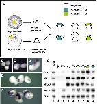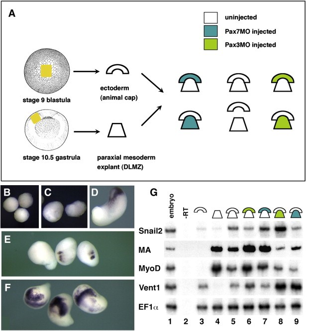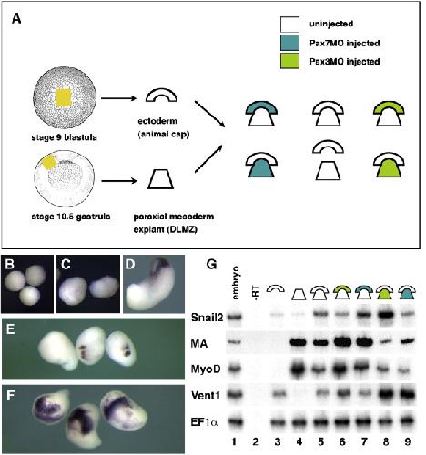 Fig. 9. Pax7 is essential for the neural crest inducing activity of the paraxial mesoderm, while Pax3 acts in the ectoderm. (A) We have recombined the stage 9 blastocoel roof ectoderm to stage 10.25 prospective paraxial mesoderm (dorsalâlateral marginal zone), a classical assay for neural crest induction in the ectoderm. Ectoderm and DLMZ were dissected from either control uninjected or Pax3 or Pax7 morphants (see color code). Ectoderm (B) or DLMZ (C) grown alone until stage 18 do not express snail2, while the recombined explants (D) do. When the DLMZ comes from Pax7 morphant (E), snail2 induction is strongly impeded, while Pax3 depleted DLMZ do not perturb snail2 induction (F). RT-PCR analysis (G) further shows that ectoderm alone (lane 3) does not express snail2, myoD or muscle actin (MA), DLMZ alone expresses only myoD and MA (lane 4) while the recombinant expresses both (lane 5). Snail2 induction is impaired if the ectoderm is depleted for Pax3 (lane 6) but not for Pax7 (lane 7). In contrast, snail2 induction is normal if DLMZ comes from Pax3 morphants (lane 8) but is impaired for Pax7 depleted DLMZ (lane 9). In both Pax3- and Pax7-depleted DLMZ, myoD and MA expression are decreased while vent1 is abnormally upregulated.