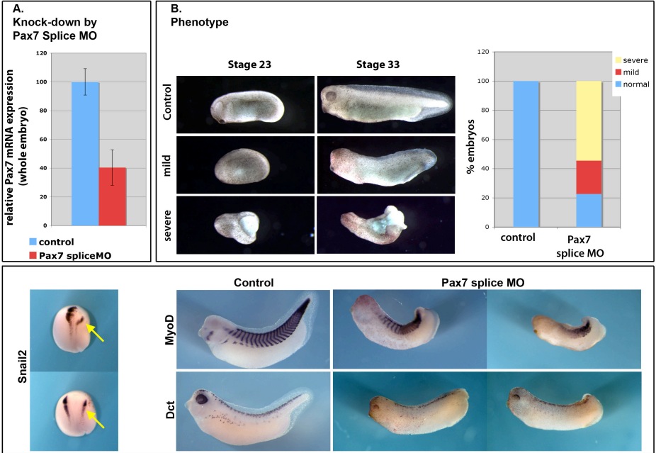 Sup. Fig 6. Pax7 splice MO phenotype. A splice-blocking morpholino was designed (see Supplemental Fig. 2). Injections in whole embryos were monitored for pax7 expression by semi-quantitative RT-PCR followed by phospho-imager analysis. This shows that the Pax7 splice MO decreases pax7 expression by 60% at the dose used here, at tailbud stage 22 (A). The morphology of the embryos (whole embryo injections) was similar to the one observed for Pax7MO (translation blocking MO) (B) with a slightly milder percent of severe embryos. Marker genes analyzed during neurulation or later on displayed similar defects as those observed with the Pax7MO (see Fig. 6).