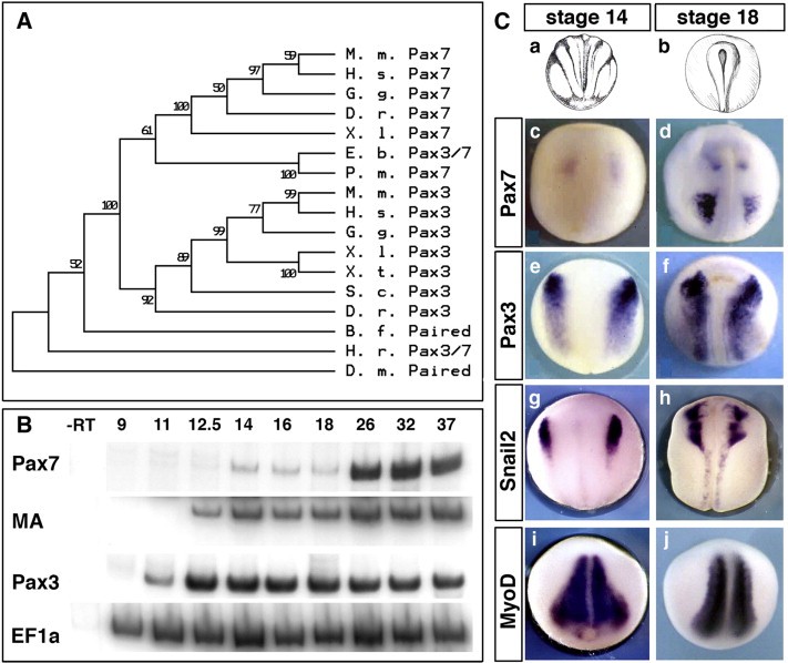 Fig. 1. Expression of pax7 and pax3 compared during neurulation in Xenopus laevis. (A) A bootstrap phylogenetic tree illustrates the clear grouping of pax7 and pax3 paralogs in vertebrates while the chordate have a single Pax3/7 gene. Accession numbers are given in Supplemental Fig. 1. (B) RT-PCR analysis on whole embryos shows the early onset of pax3 expression during gastrulation (i.e. at times of neural crest induction), whereas pax7 is detected at mid-neurulation, after muscle actin (MA) is detected. EF1α is used as a baseline control. (C) In situ hybridization on stage-matched sibling embryos confirms the late onset of pax7, in brain first (c) then in paraxial mesoderm, and the lack of expression in the neural crest progenitor area (c, d). In contrast, pax3 and snail2 label neural crest (eâh). Myod marks paraxial mesoderm (i, j).