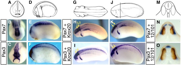 Fig. 2. Distinct pax7 and pax3 patterns in central nervous system and paraxial mesoderm at tailbud stages. (AâC) Front views of stage 22 embryos (A) show pax7 expression in the caudal part of the brain (B), whereas pax3 labels both the whole brain and the hatching gland (C). (DâF) Side views (D) illustrate pax7 restriction to mesencephalon, hindbrain and anterior spinal cord whereas pax3 is found along the entire anteriorâposterior length of the central nervous system. Pax7 labels the central paraxial mesoderm while pax3 is found in hypaxial cells. (GâL) Dorsal (GâI) and side (JâL) views of tailbud stage 24, with double staining for pax3 or pax7 and krox20, which labels hindbrain rhombomeres r3 and r5 (yellow arrows), confirms the limited extent of pax7 expression along the spinal cord. (MâO) Tailbud stage 24 transverse sections were double-stained with 12â101 myotome marker (brown). This shows pax7 expression in the alar plate of the anterior-most spinal cord and medial myotome (N) and pax3 in the roof plate, alar plates and in the hypaxial myotome (O).