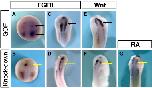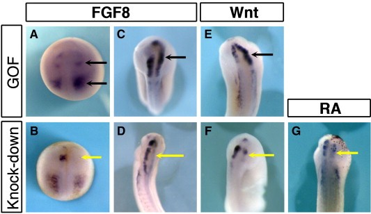 Fig. 3. pax7 pattern in the brain is positively regulated by FGF, Wnt and retinoid signals. (AâD) FGF8 gain of function expands pax7 expression into forebrain, while FGF8 depletion leads to lack of pax7 at induction stage (stage18, A, B) and in later development (stage 22, C, D). (EâF) Wnt7b over-expression and beta-catenin morpholino injections demonstrate the requirement for Wnt signals in pax7 patterning. (G) Similarly, blocking retinoic acid signaling resulted in defective pax7 expression.