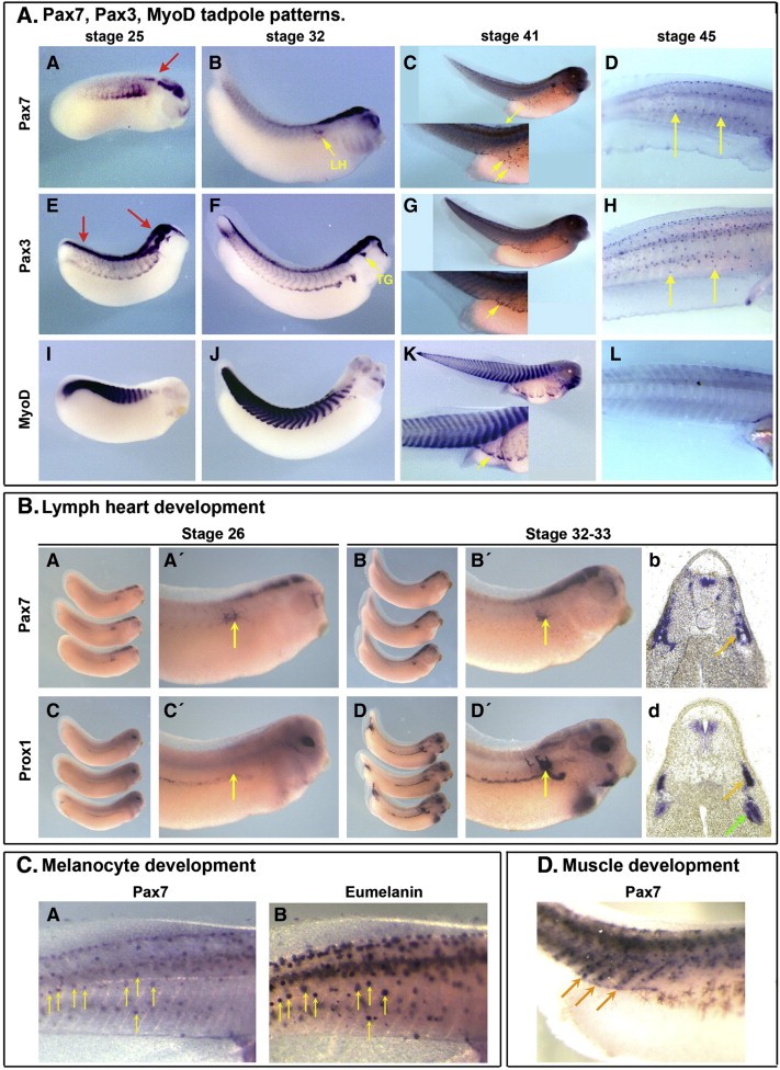 Fig. 5. Pax7 expression in tadpoles. A/ At tailbud stage (st. 25â32) pax7 exhibits a dynamic expression in the myotome, which vanishes at late stage, while brain and spinal cord expression remains restricted to hindbrain and anterior spinal cord (AâB). Pax7 is also found in the lymph heart (B, arrow). This contrasts to pax3 expression in the entire length of the spinal cord, in the hypaxial muscle and trigeminal ganglia (EâF, arrows) or to myod expression in the epaxial muscles (IâJ). At swimming tadpole stage (st 41â45), pax7 is expressed in scattered cells on the side of the embryo (yellow arrows) and cells that align at the edge of the myotome cells (see D/), while pax3 and myod mark muscle (G, K). Both pax7 and pax3, but not myod, label melanocytes (D, H, L). B/ During lymph heart development, pax7 is detected earlier than the lymph heart marker prox1 (A, Aâ², C, Câ²). By stage 33, both pax7 and prox1 expression overlap in the lymph heart (B, Bâ², D, Dâ² and transverse sections b, d, yellow arrows), while prox1 is also expressed adjacent to the cardinal vein (green arrow; Ny et al., 2005). C/ Late tadpoles where photographed before bleaching to position the melanocytes (B) and then pax7 was revealed (A). Most melanocytes were labelled by pax7 (yellow arrows). D/ Some pax7-positive cells aligned at the edge of each myotome in stage 41 tadpoles and may constitute the prospective satellite cell population (arrows).
