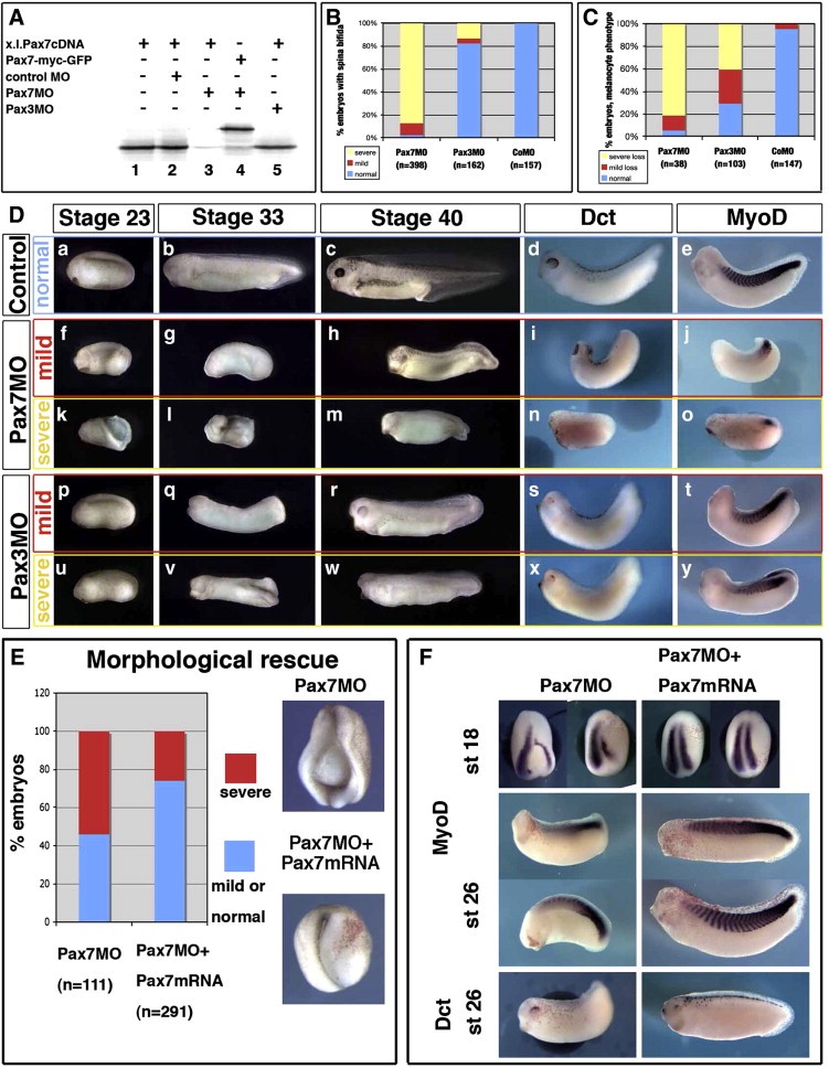 Fig. 6. Pax7 morphants are affected in earlier stages than Pax3 morphants, although both display mesoderm and neural crest defects. (A) Pax7MO blocks in vitro translation of pax7 (lane 3) but neither that of a pax7-gfp fusion lacking the MO-binding sequence (lane 4), nor of pax3 (5). (B) Pax7 morphants display early and severe elongation defects shortly after gastrulation (yellow), while a few of them exhibit milder phenotypes allowing us to follow their development further (red). In contrast, Pax3 morphants are rather normal until the end of neurulation except for posterior spina bifida in the more severely affected ones (yellow). (C) Melanocyte development was analyzed in later stage embryos, among the mild phenotype for Pax7 morphants, and in Pax3 morphants. Severe loss refers to the lack of dct positive or pigmented cells, while âmild lossâ refers to decreased melanocyte number associated to lack of melanocyte migration. (D) Sibling control embryos (aâe), Pax7 morphants with mild (fâj) or severe (kâo) phenotype, Pax3 morphants with mild (pât) or severe (uây) phenotype were analyzed at the end of neurulation (stage 23), tailbud stage 33 or swimming tadpole stage 45, and stained for dct and myod at stage 33. They display prominent head, brain, mesoderm and melanocytes defects. (E)The Pax7MO phenotype is rescued by co-injections with Pax7-myc mRNA, insensitive to the morpholino. See text for details. (F) Both myoD and dct expression are rescued by pax7 mRNA injection into Pax7 morphants (see text for details).