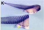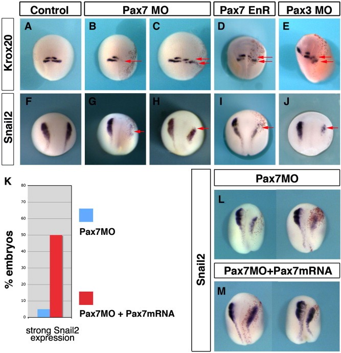 Fig. 7. Pax7 and Pax3 are essential for hindbrain and neural crest patterning. The early phenotype of Pax7 morphants was analyzed at stage 18. Control siblings show normal expression of krox20 (A) and snail2 (F). Pax7 morphants exhibit either a severe loss of krox20 (B) and snail2 (G), or a posterior shift of rhombomeres r3 and r5 (C, arrows) accompanied by reduced snail2 expression (H). A similar phenotype is observed in Pax7EnR injected embryos (D, I) or Pax3 morphants (E, J). Pax7MO phenotype is rescued by injection of Pax7-myc mRNA), insensitive to the morpholino (Fig. 6): snail2 expression is restored (L shows two morphants and (M) two siblings injected with MO and the rescue construct).