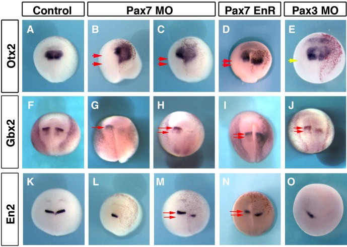 Fig. 8. Pax7 and Pax3 regulate midâhindbrain boundary maintenance. Pax7 depletion leads to forebrainâmidbrain expansion as seen by otx2 posterior expansion (B, C). This is accompanied by loss or posterior shift of the midâhindbrain boundary (Gbx2, G, H) and En2 (L, M). A similar phenotype is observed after PaxEnR (D, I, N). Pax3 morphants do not exhibit expanded otx2 domain (E, yellow arrow indicates similar posterior boundaries on each side), but they also display defective or shifted midâhindbrain boundary (J, O). Red arrows indicate the extent of shift between the posterior boundary on control non-injected (left) side, and the shifted boundary on injected (right) side.